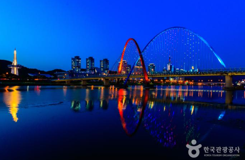 1993년 대전 엑스포의 상징인 한빛탑은 대전의 과거와 미래를 연결하는 랜드마크입니다. 밤이 되면 한빛탑 외벽에 펼쳐지는 화려한 미디어 파사드와 신나는 음악에 맞춰 춤추는 음악 분수는 대전의 야경을 장식하는 최고의 하이라이트입니다.